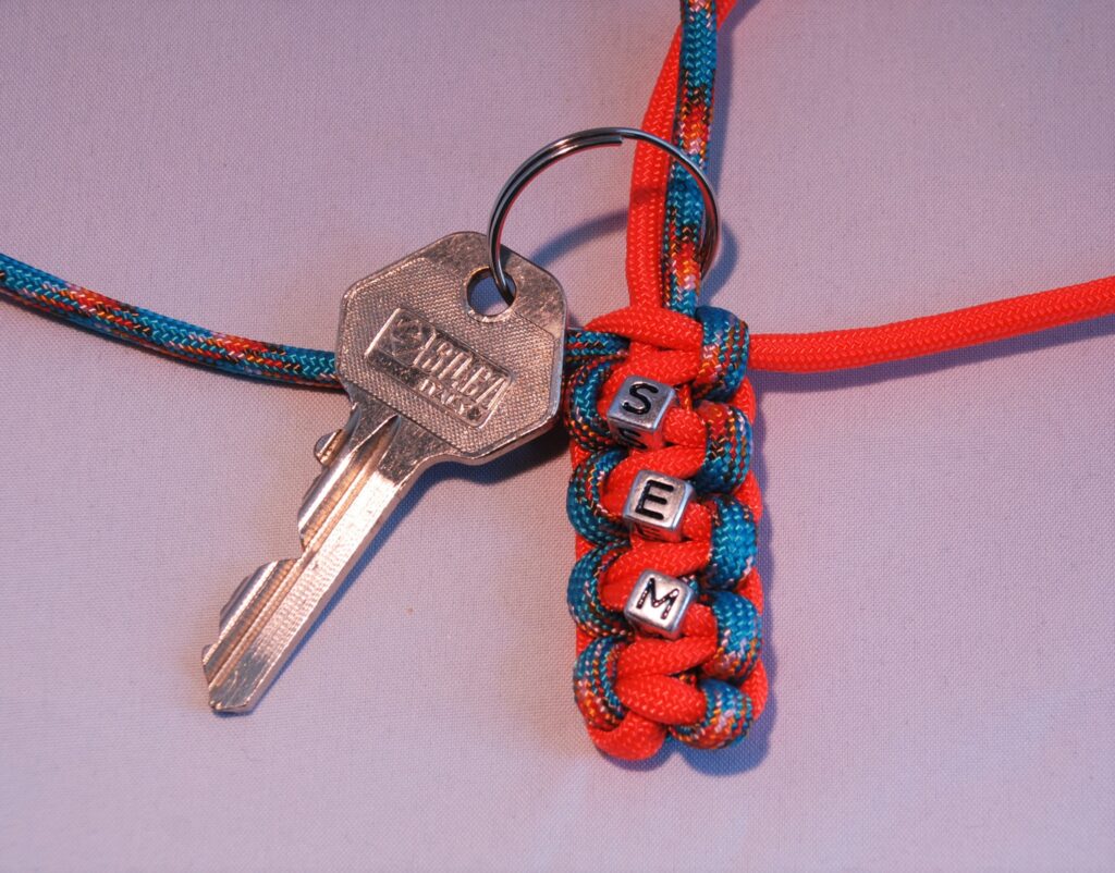 Op de eerste foto heb ik als voorbeeld de compleet afgewerkte sleutelhanger gemaakt met de naam “SHELLY”, in de kleur bordeaux-rood. Op de andere foto’s kunt u een idee krijgen van de kleuren met de letters. Bij deze voorbeelden is het paracord nog niet afgeknipt en afgewerkt. Uiteraard krijgt u een afgewerkt exemplaar met een sleutelring.